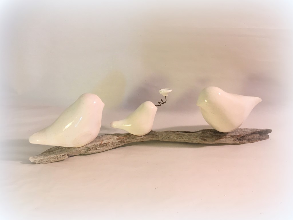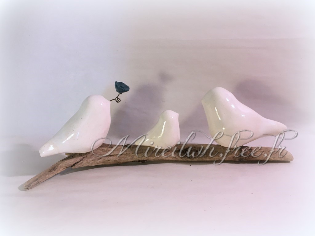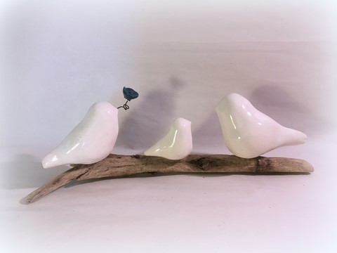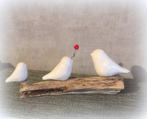 Trio d'oiseaux en céramique sur bois flotté du Médoc et d'ailleurs. Composition de trois oiseaux (photo non contractuelle) S'agissant de pièces uniques, le bois et la disposition des oiseaux varient d'une composition à l'autre. Si vous avez une demande particulière, n'hésitez pas à me contacter
